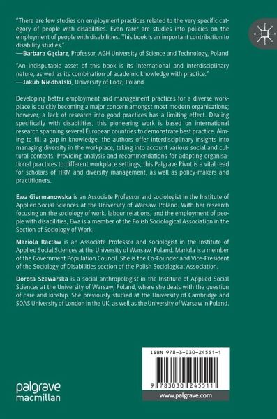 Developing better employment and management practices for a diverse workplace is quickly becoming a major concern amongst most modern organisations; however, a lack of research into good practices has a limiting effect. Dealing specifically with disabilities, this pioneering work is based on international research spanning several European countries to demonstrate best practice. Aiming to fill a gap in knowledge, the authors offer interdisciplinary insights into managing diversity in the workplace, taking into account various social and cultural contexts. Providing analysis and recommendations for adapting organisational practices to different workplace settings, this Palgrave Pivot is a vital read for scholars of HRM and diversity management, as well as policy-makers and practitioners.