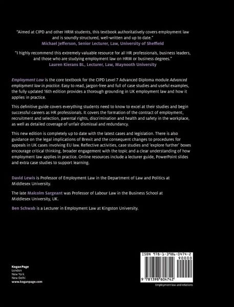 Employment Law is the core textbook for the CIPD Level 7 module of the same name. Easy to read, jargon-free and full of case studies and useful examples this fully updated 16th edition provides a thorough grounding in UK employment law and how it applies in practice. This definitive guide covers everything students need know to excel at their studies and begin a successful career as an HR professional. It covers the formation of the Contract of Employment, recruitment and selection, parental rights, discrimination and health and safety in the workplace. There is also essential coverage of unfair dismissal and redundancy. This new edition is completely up to date with the latest cases and legislation including updates to discrimination law and working time. There is also guidance on the legal implications of Brexit such as freedom of movement, workers' rights and the change to procedural arrangements for the final court of appeal in UK cases. Reflective activities, case studies and explore further boxes encourage critical thinking, broader engagement with the topic and a clear understanding of how employment law applies in practice, Online resources include a lecturer guide, powerpoint slides and extra case studies to support learning and enable students to apply the theory in practice.