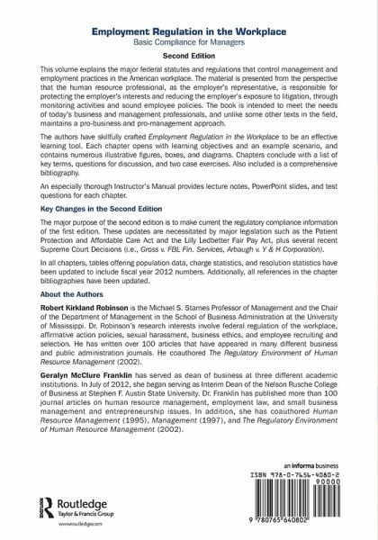 This textbook acquaints readers with the major federal statutes and regulations that control management and employment practices in the American workplace. The material is presented from the perspective that the human resource professional is the employer's representative and is, therefore, responsible for protecting the employer's interests and reducing the employer's exposure to litigation through monitoring activities and viable employee policies. The book is designed as a tool for today's business and management professionals, and unlike some other texts in the field, maintains a pro-business or pro-management approach. The authors have skilfully crafted Employment Regulation in the Workplace to be an effective learning tool. Each chapter opens with learning objectives and an example scenario, and each chapter contains plenty of illustrative figures, boxes, and diagrams. Chapters conclude with a listing of key terms, questions for discussion, and two case exercises. The book also includes a comprehensive bibliography.