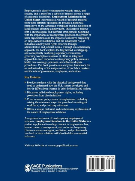 This book presents an overview of the economic, political, and social forces that shaped contemporary employment relations practices in United States. It provides students with the historical background they need to understand how the US system developed and how it differs from systems in other industrialized nations. Individual employment rights, including protecting individual employees from discrimination and workplace `rights', are thoroughly examined. In addition, current policy issues in employment (raising the minimum wage, growth of a contingent workforce, privatizing retirement) are discussed in detail.