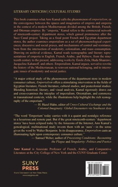 A comparative study of iconographic and fictional representations of department stores in France and Egypt, as sites of imperial and Mediterranean cultural memory, from 1869 to the present. Shortlisted for the 2025 First Book Prize presented by the Modernist Studies Association Honorable Mention, for the 2025 René Wellek Prize presented by the American Comparative Literature Association This book examines what Amr Kamal calls the phenomenon of emporialism, or the convergence between the spaces and imaginaries of empires and emporia in the context of a modern Mediterranean divided among the British, French, and Ottoman empires. By "emporia," Kamal refers to the commercial network of nineteenth-century department stores, which gained prominence after the Suez Canal project. Taking as a focal point French and Egyptian department stores, the author examines emporialism as a set of phenomenological experiences, discursive and social praxes, and mechanisms of control and resistance, born from the intersection of modernity, colonialism, and mass consumption. Drawing on archival evidence, Kamal reads iconographic and literary representations of emporia in English, French, Arabic, and Hebrew, from the nineteenth century to the present, addressing works by Émile Zola, Huda Shaarawi, Jacqueline Kahanoff, and others. Emporialism, Kamal argues, served to rewrite the history of the Mediterranean, to reinvent national belonging, and to interrogate issues of modernity and social justice.