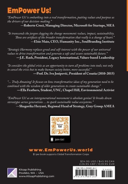 EmPower Us! challenges you to see the world as it could be & join us to reinvent it. The transformative journey is a global imperative. It begins with integrating the TEST Values (Trust, Empathy, Sustainability, Transparency) They are the currency and accelerator for transformation for all of Us our organizations, and our world! It empowers leaders to become Catalyzers of ongoing transformation. The book redefines the Power of intersecting generations to collaborate on inclusive solutions to achieve a sustainable future. Its action roadmap challenges progressive leaders and Rising Voices (Next Generation, Women, Marginalized) to augment their shared Purpose to 'fix our broken world.