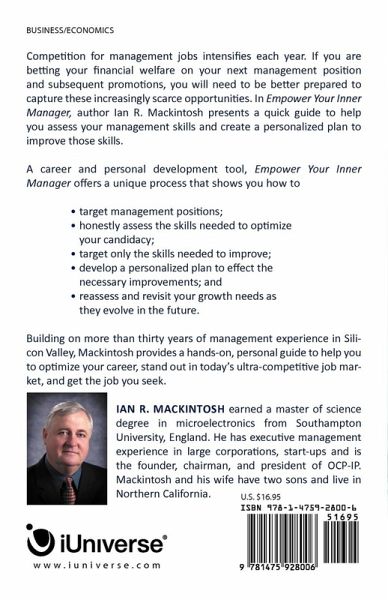 Competition for management jobs intensifies each year. If you are betting your financial welfare on your next management position and subsequent promotions, you will need to be better prepared to capture these increasingly scarce opportunities. In Empower Your Inner Manager, author Ian R. Mackintosh presents a quick guide to help you assess your management skills and create a personalized plan to improve those skills. A career and personal development tool, Empower Your Inner Manager offers a unique process that shows you how to • target management positions; • honestly assess the skills needed to optimize your candidacy; • target only the skills needed to improve; • develop a personalized plan to effect the necessary improvements; and • reassess and revisit your growth needs as they evolve in the future. Building on more than thirty years of management experience in Silicon Valley, Mackintosh provides a hands-on, personal guide to help you to optimize your career, stand out in today’s ultra-competitive job market, and get the job you seek.