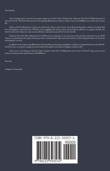 Dear Readers, Are you feeling stuck or in need of a positive change in your life? Look no further than "Empower Your Life: 50 Affirmations for 25 Areas of Growth." This book offers practical and inspiring affirmations to help you achieve success and fulfillment in various areas of your life. Inside, you'll find affirmations to boost your self-esteem, achieve career success, attract financial abundance, embrace your body, find love and happiness, and much more. Whether you're struggling with anxiety, stress, procrastination, addiction, or negative self-talk, this book has the tools to help you overcome your obstacles and empower yourself to live your best life. "Empower Your Life" offers affirmations for 25 different areas of growth, so you can focus on the areas that matter most to you. With chapters on spiritual growth, improved memory, better communication skills, increased creativity, and breaking bad habits, this book has something for everyone. In addition to the empowering affirmations, the book offers practical tips and guidance to help you integrate them into your daily life. You'll learn how to set goals, manage your time, build self-discipline, and cultivate a brighter outlook on life. Don't wait to start living your best life. Order "Empower Your Life: 50 Affirmations for 25 Areas of Growth" today and start your journey towards personal empowerment and fulfillment. Sincerely, Gumption Commander