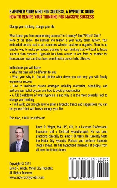 Change your thinking, change your life. What keeps you from experiencing success? Is it money? Time? Effort? Skill? None of the above. The number one reason is your faulty belief system. Your embedded beliefs lead to all outcomes whether positive or negative. There is no simpler way to make permanent changes to your thinking that will lead to future success than hypnosis. Hypnosis has been around in one form or another for thousands of years and has been scientifically proven to be effective. In this book you will learn: · Why this time will be different for you · What your why is. You will define what drives you and why you will finally experience success · How to implement proven strategies including motivation, scheduling and address your belief system and how to avoid procrastination · A full breakdown of what hypnosis is and why it is the most powerful tool to change your thinking · I will walk you through how to enter a hypnotic trance and suggestions you can tell yourself that will forever change your life This time, it WILL be different!