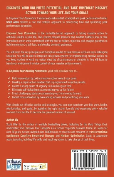 DISCOVER YOUR UNLIMITED POTENTIAL AND TAKE IMMEDIATE MASSIVE ACTIONTOWARD YOUR LIFE AND YOUR GOALS In Empower Your Momentum, transformational mindset strategist and peak performance trainer Scott Allan delivers a raw and realistic approach to maximizing time and optimizing peak performance strategies. Empower Your Momentum is the no-holds-barred approach to taking massive action to optimize results in your life. This system teaches learners and mindset builders how to take immediate action when confronted with the fear of failure, rejection, and analysis paralysis to build momentum, crush fear, and develop personal greatness. You will learn the key principles and discipline needed to take massive action in any challenging situation. You will be able to integrate this proven system for implementing massive action, so you keep moving forward, no matter the circumstances or situation. You will learn to bend your environment to take control of your massive action moment. In Empower Your Morning Momentum, you'll also discover how to... Build momentum by taking massive action toward your goals Develop a rapid-action mindset that is programmed to get big results Create a strong sense of urgency to maximize your time Eliminate self-defeating excuses setting you up for failure Crush challenging obstacles preventing you from moving forward Defeat procrastination by overcoming laziness and prioritizing your work With simple but effective tactics and strategies, you can now transform your life, work, health, relationships, and goals...by applying the rapid action formula and squeezing every valuable moment of this life to become the greatest version of yourself.