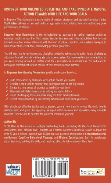 DISCOVER YOUR UNLIMITED POTENTIAL AND TAKE IMMEDIATE MASSIVE ACTIONTOWARD YOUR LIFE AND YOUR GOALS In Empower Your Momentum, transformational mindset strategist and peak performance trainer Scott Allan delivers a raw and realistic approach to maximizing time and optimizing peak performance strategies. Empower Your Momentum is the no-holds-barred approach to taking massive action to optimize results in your life. This system teaches learners and mindset builders how to take immediate action when confronted with the fear of failure, rejection, and analysis paralysis to build momentum, crush fear, and develop personal greatness. You will learn the key principles and discipline needed to take massive action in any challenging situation. You will be able to integrate this proven system for implementing massive action, so you keep moving forward, no matter the circumstances or situation. You will learn to bend your environment to take control of your massive action moment. In Empower Your Morning Momentum, you'll also discover how to... Build momentum by taking massive action toward your goals Develop a rapid-action mindset that is programmed to get big results Create a strong sense of urgency to maximize your time Eliminate self-defeating excuses setting you up for failure Crush challenging obstacles preventing you from moving forward Defeat procrastination by overcoming laziness and prioritizing your work With simple but effective tactics and strategies, you can now transform your life, work, health, relationships, and goals...by applying the rapid action formula and squeezing every valuable moment of this life to become the greatest version of yourself.