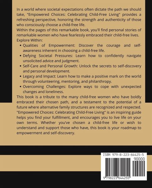 Are you one of the many women who have made the conscious choice to live a fulfilling child-free life? If so, "Celebrating Child-Free Living" is the empowering and uplifting guide you've been waiting for. In a world that often emphasizes traditional family structures, this book offers a refreshing perspective, focusing on the diverse range of women who have made the empowering choice to live a life without children. Through powerful personal stories, expert insights, and practical guidance, this book highlights the positivity of embracing a child-free lifestyle. Explore the unique qualities and characteristics that define those who make this decision, and learn how to navigate societal pressures and challenges with grace. From building supportive relationships to finding personal growth and fulfillment beyond motherhood, "Empowered Choices" empowers you to craft your own path and thrive in it. Discover strategies to handle unsolicited advice and judgment, nurture your well-being, and contribute positively to the world through volunteering and mentoring. As we venture into a changing world, this book also provides a glimpse of a future where child-free living is celebrated and respected, and alternative family structures are embraced. "Empowered Choices: Celebrating Child-Free Living" is an inspiring guide for women who have chosen the child-free path and for those seeking to better understand and support them. Celebrate your choices, find your fulfillment, and embrace the strength of living life on your terms.