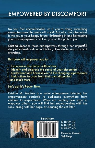 Do you feel uncomfortable, or that you are doing something wrong because your life seems off track? Actually, that discomfort is the key to your future. Embracing it, and discovering the five superpowers you already possess, will set you on the path to joy. Cristina decodes these superpowers and shows you how to turn discomfort and discontent into power. Through her impactful story of widowhood and addiction, she transforms popular ideas about the nature of what makes us uncomfortable and challenges us to embrace our messy and less than perfect lives. Using client stories and practical exercises, Cristina teaches you to harness your own strengths and dismantle the barriers holding you back. Let's go! It's Power Time. This book will empower you to: Experience discomfort without fear Identify and embrace the cause of your discomfort Help others (partners, children, employees) to embrace their own discomfort Understand and harness 5 superpowers you already possess to change your life...and much more.