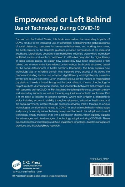 Acknowledgment. About the Authors. Part I Government Response and Impacts. Chapter 1 Introduction: Primary and Secondary Effects of COVID 19. Chapter 2 COVID 19 US Response. Part II Technology Use across the Health Domains. Chapter 3 Businesses and Self Employment. Chapter 4 Employment during COVID 19. Chapter 5 Education During COVID 19. Chapter 6 Access to Services and Resources. Chapter 7 Healthcare and Mental Health During COVID 19. Part III Unique COVID 19 Considerations and the Future Forward. Chapter 8 COVID 19 Mobile Applications. Chapter 9 Privacy and Security. Chapter 10 Conclusion. Index.