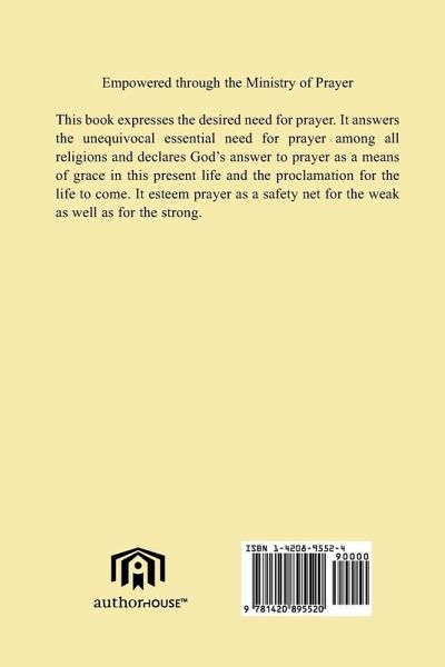 This book expresses the desired need for prayer. It answers the unequivocal essential need for prayer among all religions and declares God's answer to prayer as a means of grace in this present life and the proclamation for the life to come. It esteem prayer as a safety net for the weak as well as for the strong.