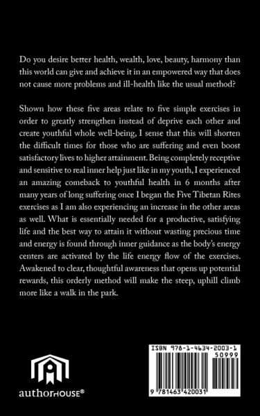 Do you desire better health, wealth, love, beauty, harmony than this world can give and achieve it in an empowered way that does not cause more problems and ill-health like the usual method? Shown how these five areas relate to five simple exercises in order to greatly strengthen instead of deprive each other and create youthful whole well-being, I sense that this will shorten the difficult times for those who are suffering and even boost satisfactory lives to higher attainment. Being completely receptive and sensitive to real inner help just like in my youth, I experienced an amazing comeback to youthful health in 6 months after many years of long suffering once I began the Five Tibetan Rites exercises as I am also experiencing an increase in the other areas as well. What is essentially needed for a productive, satisfying life and the best way to attain it without wasting precious time and energy is found through inner guidance as the body's energy centers are activated by the life energy flow of the exercises. Awakened to clear, thoughtful awareness that opens up potential rewards, this orderly method will make the steep, uphill climb more like a walk in the park.