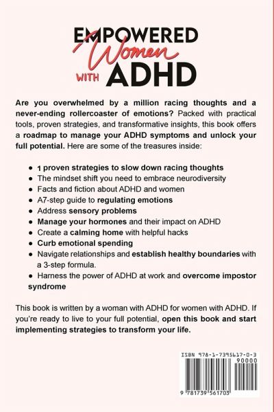 Are you overwhelmed by a million racing thoughts and a never-ending rollercoaster of emotions? Then keep reading. Do you constantly feel on the edge of burning out? Like you're always either stuck in hyperfocus or hyper-fatigue? Do you feel held back at work or in relationships? Do you live in constant fear of rejection, criticism, or judgment? Do you feel like putting your house in order is as big of a task as climbing Mount Everest, even though the clutter around you makes your mind feel cluttered too? Have you always felt like you didn't quite fit in? I know. I've been there. Imagine having a switch to silence the constant chatter in your brain. Imagine feeling accepted and understood for who you truly are. Did you know that only 3.2% of women in the U.S. are diagnosed with ADHD compared to 5.4% of men? That's 69% more diagnoses for men when the prevalence is about the same! We've been unseen for far too long. But the tide is turning, and adult women are now the fastest-growing group diagnosed with ADHD. Inside this complete guide, specifically tailored for women, you'll find a treasure trove of practical tools, hacks, and proven strategies to help you manage your ADHD symptoms. But you don't just want to survive with ADHD; you want to thrive, right? With the guidance of this book, you'll learn to make peace with ADHD and embrace neurodiversity to unlock your full potential and live with clarity and confidence. Here are just a few of the transformative tools and strategies you will discover in this book: From the American Psychiatry Association to the Royal College of Psychiatrists in the U.K., leading psychiatric associations emphasize that lifestyle changes can improve ADHD symptoms, with or without medication. If you're ready to make ADHD work for you rather than against you, then "Empowered Women with ADHD" is the book you need, even if you have the attention span of a goldfish and feel like you're drowning in a sea of information. It is a practical guide written by a woman with ADHD for busy women with ADHD. You can start implementing strategies right now and at your own pace.