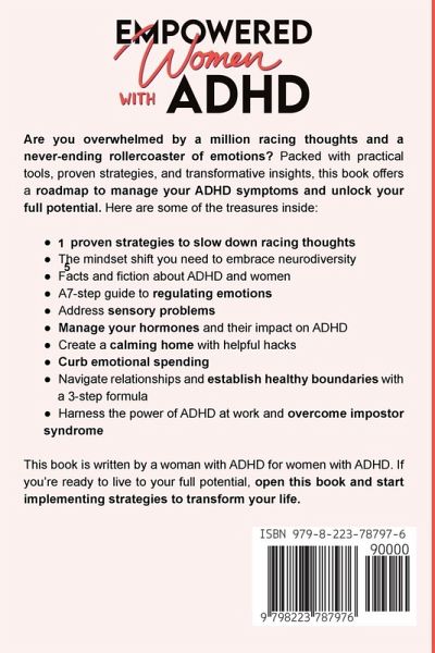 Are you overwhelmed by a million racing thoughts and a never-ending rollercoaster of emotions? Then keep reading. Do you constantly feel on the edge of burning out? Like you're always either stuck in hyperfocus or hyper-fatigue? Do you feel held back at work or in relationships? Do you live in constant fear of rejection, criticism, or judgment? Do you feel like putting your house in order is as big of a task as climbing Mount Everest, even though the clutter around you makes your mind feel cluttered too? Have you always felt like you didn't quite fit in? I know. I've been there. Imagine having a switch to silence the constant chatter in your brain. Imagine feeling accepted and understood for who you truly are. Did you know that only 3.2% of women in the U.S. are diagnosed with ADHD compared to 5.4% of men? That's 69% more diagnoses for men when the prevalence is about the same! We've been unseen for far too long. But the tide is turning, and adult women are now the fastest-growing group diagnosed with ADHD. Inside this complete guide, specifically tailored for women, you'll find a treasure trove of practical tools, hacks, and proven strategies to help you manage your ADHD symptoms. But you don't just want to survive with ADHD; you want to thrive, right? With the guidance of this book, you'll learn to make peace with ADHD and embrace neurodiversity to unlock your full potential and live with clarity and confidence. Here are just a few of the transformative tools and strategies you will discover in this book:15 proven strategies to slow down your racing thoughts Facts and fiction when it comes to ADHD and women The mindset shift you need to embrace neurodiversity The 7-step guide to regulating emotions How to craft your own sensory diet to address sensory problems How to manage your hormones and their impact on ADHD The three simple steps you need to tackle the floordrobe (you know, that pile of clothes on the floor). And many more hacks to create a calming home How to make peace with your bank account and curb emotional spending The 3-step formula you need to set healthy boundaries How to navigate your relationships with friends, family, and professionals. We'll even talk about sex, baby! All the tools to harness the power of ADHD at work and tackle impostor syndrome And much more! From the American Psychiatry Association to the Royal College of Psychiatrists in the U.K., leading psychiatric associations emphasize that lifestyle changes can improve ADHD symptoms, with or without medication. If you're ready to make ADHD work for you rather than against you, then "Empowered Women with ADHD" is the book you need, even if you have the attention span of a goldfish and feel like you're drowning in a sea of information. It is a practical guide written by a woman with ADHD for busy women with ADHD. You can start implementing strategies right now and at your own pace. So if you want to live your life to your full potential, see you inside!