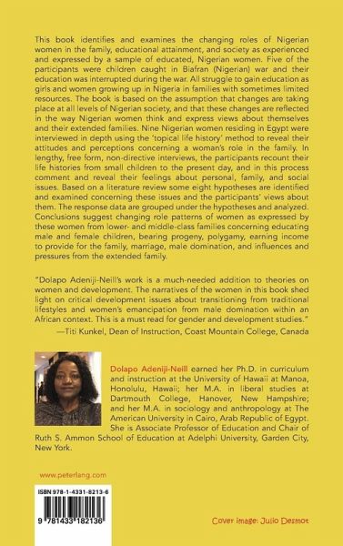 This book identifies and examine the changing roles of Nigerian women: in the family, educational attainment and society as experienced and expressed by a sample of educated, Nigerian women. Five of the participants were children caught in Biafran (Nigerian) war and their education was interrupted during the war. All struggle to gain education as girls and women growing up in Nigeria in families with sometimes limited resources. The book is based on the assumption that changes are taking place at all levels of Nigerian society, and that these changes are reflected in the way Nigerian women think and express views about themselves and their extended families. Nine Nigerian women resident in Egypt, were interviewed in depth using the 'topical life history' method to reveal their attitudes and perceptions concerning the woman's role in the family. In lengthy, free form, non-directive interviews, the participants recount their life histories from small children to the present day, and in this process comment and reveal their feelings about personal, family and social issues. Based on a literature review some eight hypotheses are identified and examined concerning these issues and the participants' views about them. The response data are grouped under the hypotheses and analyzed. Conclusions suggest changing role patterns of women as expressed by these women from lower- and middle-class families, concerning education male and female children, bearing progeny, polygamy, earning income to provide for the family, marriage, male domination and influences and pressures from the extended family.