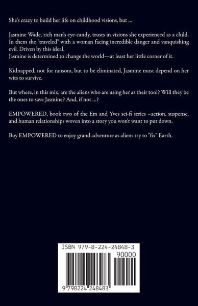 She's crazy to build her life on childhood visions, but ... Jasmine Wade, rich man's eye-candy, trusts in visions she experienced as a child. In them she "traveled" with a woman facing incredible danger and vanquishing evil. Driven by this ideal, Jasmine is determined to change the world-at least her little corner of it. Kidnapped, not for ransom, but to be eliminated, Jasmine must depend on her wits to survive. But where, in this mix, are the aliens who are using her as their tool? Will they be the ones to save Jasmine? And, if not ...? EMPOWERED, book two of the Em and Yves sci-fi series -action, suspense, and human relationships woven into a story you won't want to put down. Enjoy grand adventure as aliens try to "fix" Earth.