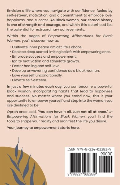 Envision a life where you navigate confidently, fueled by self-esteem, motivation, and a commitment to embrace love, happiness, and success. As Black women, our shared history is one of strength and courage; within this sisterhood lies the potential for extraordinary achievements. Within the pages of Empowering Affirmations for Black Women, you'll discover how to: Cultivate inner peace amidst life's chaos. Replace deep-seated limiting beliefs with empowering ones. Embrace success and empowerment. Ignite motivation and stimulate growth. Foster healing and self-love. Develop unwavering confidence as a black woman. Love yourself unconditionally. Elevate self-esteem. You can become a powerful Black woman in just a few minutes each day, incorporating habits that lead to happiness and success. No matter where you stand now, this is your opportunity to empower yourself and step into the woman you are destined to be. Oprah once said, "You can have it all. Just not all at once." In Empowering Affirmations for Black Women, you'll find the tools to shape your reality and manifest your desired life. Your journey to empowerment starts here.