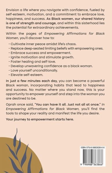Envision a life where you navigate confidently, fueled by self-esteem, motivation, and a commitment to embrace love, happiness, and success. As Black women, our shared history is one of strength and courage; within this sisterhood lies the potential for extraordinary achievements. Within the pages of Empowering Affirmations for Black Women, you'll discover how to:Cultivate inner peace amidst life's chaos. Replace deep-seated limiting beliefs with empowering ones. Embrace success and empowerment. Ignite motivation and stimulate growth. Foster healing and self-love. Develop unwavering confidence as a black woman. Love yourself unconditionally. Elevate self-esteem. You can become a powerful Black woman in just a few minutes each day, incorporating habits that lead to happiness and success. No matter where you stand now, this is your opportunity to empower yourself and step into the woman you are destined to be. Oprah once said, "You can have it all. Just not all at once." In Empowering Affirmations for Black Women, you'll find the tools to shape your reality and manifest your desired life. Ready to take the first step? Your journey to empowerment starts here