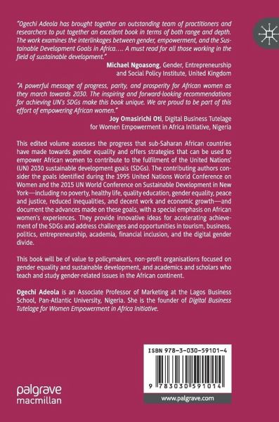 This edited volume assesses the progress that sub-Saharan African countries have made towards gender equality and offers strategies that can be used to empower African women to contribute to the fulfilment of the United Nations' (UN) 2030 sustainable development goals (SDGs). The contributing authors consider the goals identified during the 1995 United Nations World Conference on Women and the 2015 UN World Conference on Sustainable Development in New York-including no poverty, healthy life, quality education, gender equality, peace and justice, reduced inequalities, and decent work and economic growth-and document the advances made on these goals, with a special emphasis on African women's experiences. They provide innovative ideas for accelerating achievement of the SDGs and address challenges and opportunities in tourism, business, politics, entrepreneurship, academia, financial inclusion, and the digital gender divide.