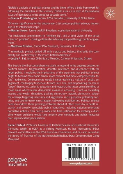 This book is the first comprehensive study to respond to the ongoing debates on political sciences' fragmentation, doubtful relevance, and disconnect with the larger public. It explores the implications of the argument that political science ought to become more topic-driven, more relevant and more comprehensible for "lay" audiences. Consequences would include evolving a culture of public engagement, challenging tendencies toward liars' rule, and emphasizing the role of "large" themes in academic education and research, the latter being identified as those areas where severe democratic erosion is occurring - such as escalating income and wealth disparities pushing democracy towards plutocracy, ubiquitous change triggering insecurity and aggression, racist prejudice polarizing societies, and counter-terrorism strategies subverting civil liberties.