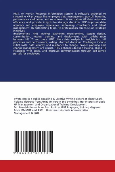 HRIS, or Human Resource Information System, is software designed to streamline HR processes like employee data management, payroll, benefits, performance evaluation, and recruitment. It centralizes HR data, enhances efficiency, and provides insights for strategic decisions. HRIS improves data accuracy and employee experience, addressing compliance and talent management. By automating tasks, HR professionals can focus on strategic initiatives.Implementing HRIS involves gathering requirements, system design, customization, testing, training, and deployment, with collaboration between HR, IT, and users. HRIS offers data analysis for insights into HR processes and performance, aiding informed decisions. Challenges include initial costs, data security, and resistance to change. Proper planning and change management are crucial. HRIS enhances decision-making, aligns HR strategies with goals, and improves communication through self-service portals for employees.