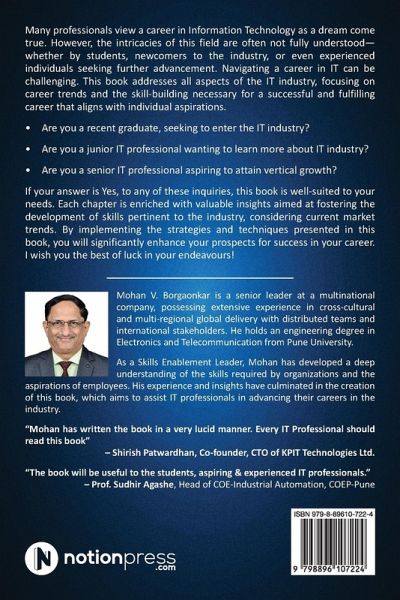 Many professionals view a career in Information Technology as a dream come true. However, the intricacies of this field are often not fully understood-whether by students, newcomers to the industry, or even experienced individuals seeking further advancement. Navigating a career in IT can be challenging. This book addresses all aspects of the IT industry, focusing on career trends and the skill-building necessary for a successful and fulfilling career that aligns with individual aspirations. - Are you a recent graduate, seeking to enter the IT industry? - Are you a junior IT professional wanting to learn more about IT industry? - Are you a senior IT professional aspiring to attain vertical growth? If your answer is Yes, to any of these inquiries, this book is well-suited to your needs. Each chapter is enriched with valuable insights aimed at fostering the development of skills pertinent to the industry, considering current market trends. By implementing the strategies and techniques presented in this book, you will significantly enhance your prospects for success in your career. I wish you the best of luck in your endeavours!