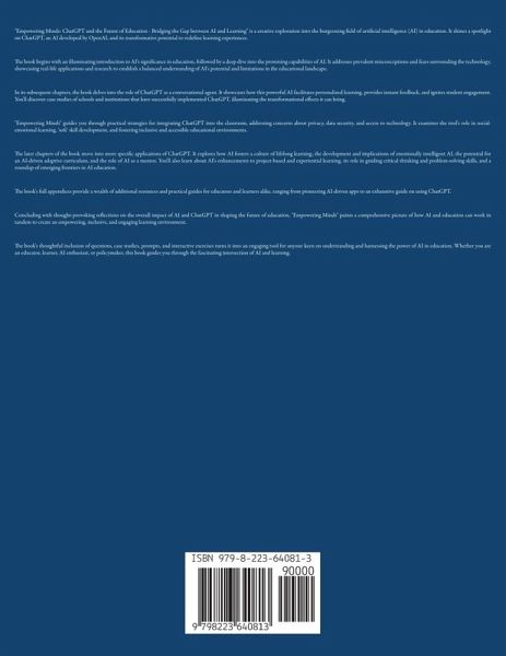 "Empowering Minds: ChatGPT and the Future of Education - Bridging the Gap between AI and Learning" is a creative exploration into the burgeoning field of artificial intelligence (AI) in education. It shines a spotlight on ChatGPT, an AI developed by OpenAI, and its transformative potential to redefine learning experiences. The book begins with an illuminating introduction to AI's significance in education, followed by a deep dive into the promising capabilities of AI. It addresses prevalent misconceptions and fears surrounding the technology, showcasing real-life applications and research to establish a balanced understanding of AI's potential and limitations in the educational landscape. In its subsequent chapters, the book delves into the role of ChatGPT as a conversational agent. It showcases how this powerful AI facilitates personalized learning, provides instant feedback, and ignites student engagement. You'll discover case studies of schools and institutions that have successfully implemented ChatGPT, illuminating the transformational effects it can bring. "Empowering Minds" guides you through practical strategies for integrating ChatGPT into the classroom, addressing concerns about privacy, data security, and access to technology. It examines the tool's role in social-emotional learning, 'soft' skill development, and fostering inclusive and accessible educational environments. The later chapters of the book move into more specific applications of ChatGPT. It explores how AI fosters a culture of lifelong learning, the development and implications of emotionally intelligent AI, the potential for an AI-driven adaptive curriculum, and the role of AI as a mentor. You'll also learn about AI's enhancements to project-based and experiential learning, its role in guiding critical thinking and problem-solving skills, and a roundup of emerging frontiers in AI education. The book's full appendices provide a wealth of additional resources and practical guides for educators and learners alike, ranging from pioneering AI-driven apps to an exhaustive guide on using ChatGPT. Concluding with thought-provoking reflections on the overall impact of AI and ChatGPT in shaping the future of education, "Empowering Minds" paints a comprehensive picture of how AI and education can work in tandem to create an empowering, inclusive, and engaging learning environment. The book's thoughtful inclusion of questions, case studies, prompts, and interactive exercises turns it into an engaging tool for anyone keen on understanding and harnessing the power of AI in education. Whether you are an educator, learner, AI enthusiast, or policymaker, this book guides you through the fascinating intersection of AI and learning.