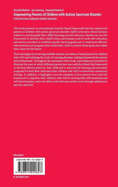 This book presents an international research-based framework that has empowered parents of children with autism spectrum disorder (ASD) to become critical decision makers to actively guide their child's learning and self-advocacy. Parents can use this framework to identify their child's vision and dreams, and to work with educators and service providers to establish specific learning goals and to implement effective interventions and programs that enable their child to achieve those goals and realise their vision for the future. The book begins by reviewing available research on evidence-based practice for children with ASD and outlining the Cycle of Learning decision-making framework for parents and professionals. Throughout the remainder of the book, case studies are presented to illustrate the ways in which different parents have successfully utilised this framework to develop effective plans for their child and to advocate for learning and education programs for both their child and other children with ASD in school and community settings. In addition, it highlights concrete examples of how parents have used the framework to empower their children with ASD to develop their self-awareness and self-determination, and to be able to self-advocate as they move through adolescence and into adult life.