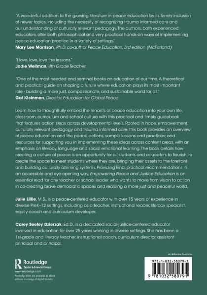 Julie Lillie, M.S., is a peace-centered educator with over 15 years of experience in diverse PreK-12 settings, including as a teacher, instructional leader, literacy specialist, equity coach and curriculum developer. More at www.thepeacepad.org Carey Seeley Dzierzak, Ed.D., is a dedicated social-justice centered educator involved in education for over 25 years working in diverse settings. She has been a 1st-grade and literacy teacher, instructional coach, curriculum director, assistant principal and principal.