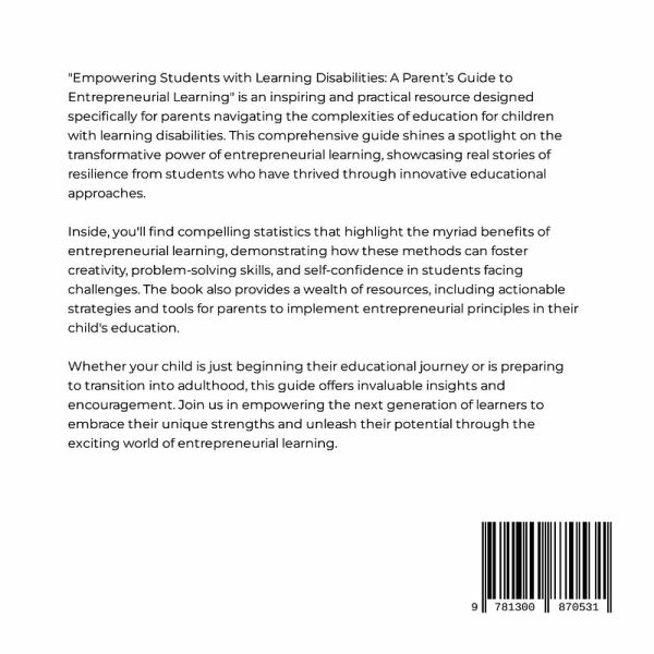 "Empowering Students with Learning Disabilities: A Parent's Guide to Entrepreneurial Learning" is an inspiring and practical resource designed specifically for parents navigating the complexities of education for children with learning disabilities. This comprehensive guide shines a spotlight on the transformative power of entrepreneurial learning, showcasing real stories of resilience from students who have thrived through innovative educational approaches. Inside, you'll find compelling statistics that highlight the myriad benefits of entrepreneurial learning, demonstrating how these methods can foster creativity, problem-solving skills, and self-confidence in students facing challenges. The book also provides a wealth of resources, including actionable strategies and tools for parents to implement entrepreneurial principles in their child's education. Whether your child is just beginning their educational journey or is preparing to transition into adulthood, this guide offers invaluable insights and encouragement. Join us in empowering the next generation of learners to embrace their unique strengths and unleash their potential through the exciting world of entrepreneurial learning.