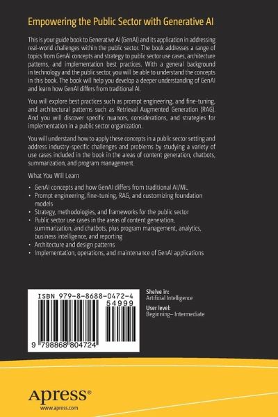 The book will help you develop a deeper understanding of GenAI and learn how GenAI differs from traditional AI. You will explore best practices such as prompt engineering, and fine-tuning, and architectural patterns such as Retrieval Augmented Generation (RAG). And you will discover specific nuances, considerations, and strategies for implementation in a public sector organization.