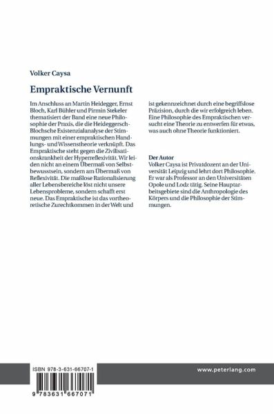 Im Anschluss an Martin Heidegger, Ernst Bloch, Karl Bühler und Pirmin Stekeler thematisiert der Band eine neue Philosophie der Praxis, die die Heideggersch-Blochsche Existenzialanalyse der Stimmungen mit einer empraktischen Handlungs- und Wissenstheorie verknüpft. Das Empraktische steht gegen die Zivilisationskrankheit der Hyperreflexivität. Wir leiden nicht an einem Übermaß von Selbstbewusstsein, sondern am Übermaß von Reflexivität. Die maßlose Rationalisierung aller Lebensbereiche löst nicht unsere Lebensprobleme, sondern schafft erst neue. Das Empraktische ist das vortheoretische Zurechtkommen in der Welt und ist gekennzeichnet durch eine begriffslose Präzision, durch die wir erfolgreich leben. Eine Philosophie des Empraktischen versucht, eine Theorie zu entwerfen für etwas, was auch ohne Theorie funktioniert.
