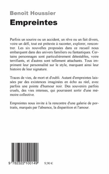 Parfois un sourire ou un accident, un rêve ou un fait divers, voire un défi, tout est prétexte à raconter, explorer, rencontrer. Les six nouvelles proposées dans ce recueil nous embarquent dans des univers familiers ou fantastiques. Certains personnages sont particulièrement détestables, voire terrifiants, et d'autres sont tellement attachants. Tous impriment leur personnalité sur le style, marquant ainsi leur histoire de leur signature.Traces de vies, de mort et d'oubli. Autant d'empreintes laissées par des existences imaginées en écho au réel, avec parfois une pointe d'humour noir. Des souvenirs parfois cruels, des vies intenses, qui pourraient sortir d'une mémoire collective. Empreintes nous invite à la rencontre d'une galerie de portraits, marqués par l'absence, la disparition et l'amour.