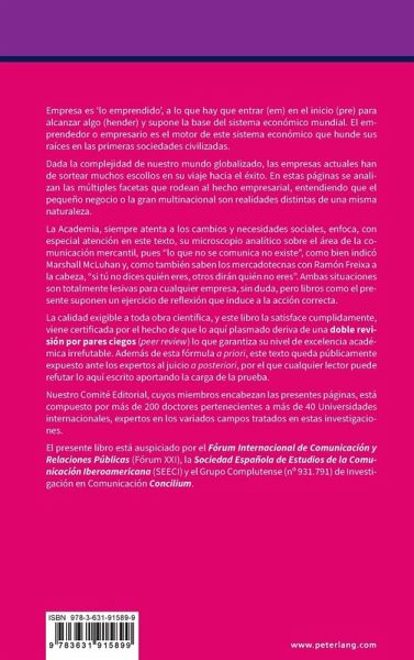 ¿ Empresa es 'lo emprendido', a lo que hay que entrar (em) en el inicio (pre) para alcanzar algo (hender) y supone la base del sistema económico mundial. El emprendedor o empresario es el motor de este sistema económico que hunde sus raíces en las primeras sociedades civilizadas. Dada la complejidad de nuestro mundo globalizado, las empresas actuales han de sortear muchos escollos en su viaje hacia el éxito. En estas páginas se analizan las múltiples facetas que rodean al hecho empresarial, entendiendo que el pequeño negocio o la gran multinacional son realidades distintas de una misma naturaleza. La Academia, siempre atenta a los cambios y necesidades sociales, enfoca, con especial atención en este texto, su microscopio analítico sobre el área de la comunicación mercantil, pues "lo que no se comunica no existe", como bien indicó Marshall McLuhan y, como también saben los mercadotecnas con Ramón Freixa a la cabeza, "si tú no dices quién eres, otros dirán quién no eres". Ambas situaciones son totalmente lesivas para cualquier empresa, sin duda, pero libros como el presente suponen un ejercicio de reflexión que induce a la acción correcta. La calidad exigible a toda obra científica, y este libro la satisface cumplidamente, viene certificada por el hecho de que lo aquí plasmado deriva de una doble revisión por pares ciegos (peer review) lo que garantiza su nivel de excelencia académica irrefutable. Además de esta fórmula a priori, este texto queda públicamente expuesto ante los expertos al juicio a posteriori, por el que cualquier lector puede refutar lo aquí escrito aportando la carga de la prueba. Nuestro Comité Editorial, cuyos miembros encabezan las presentes páginas, está compuesto por más de 200 doctores pertenecientes a más de 40 Universidades internacionales, expertos en los variados campos tratados en estas investigaciones. El presente libro está auspiciado por el Fórum Internacional de Comunicación y Relaciones Públicas (Fórum XXI), la Sociedad Española de Estudios de la Comunicación Iberoamericana (SEECI) y el Grupo Complutense (nº 931.791) de Investigación en Comunicación Concilium.