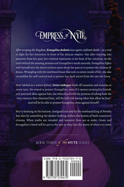 After escaping the kingdom, Evangeline Ardonis once again confronts death-in a trial to fight for her innocence in front of the Atiacan empire-but after running into someone from her past, her criminal reputation is the least of her concerns. As the truth behind the missing persons and Evangeline's mark unravels, Evangeline fights with herself over the desire to learn more about her past or to protect the citizens of Atiaca. Wrangling with the newfound beast that now co-exists inside of her, she also scrambles for self-control and to protect her dark secret from the one she loves. Now labeled as a traitor prince, Ceven LuRogue fends off assassins and enemies at every turn. He vowed to protect Evangeline, even if it means turning his friends and potential allies against him, but when faced with the promise of taking back the very country that shunned him, will he still risk losing what few allies he has? And will he be able to protect Evangeline, even against herself? War is looming on the horizon, instigated not only by the newfound king of Peredia but also by something far darker lurking within the hearts of both countries' citizens. When truths are revealed and innocent lives are at stake, Ceven and Evangeline's bond will be put to the test as they face the worst of what's to come.