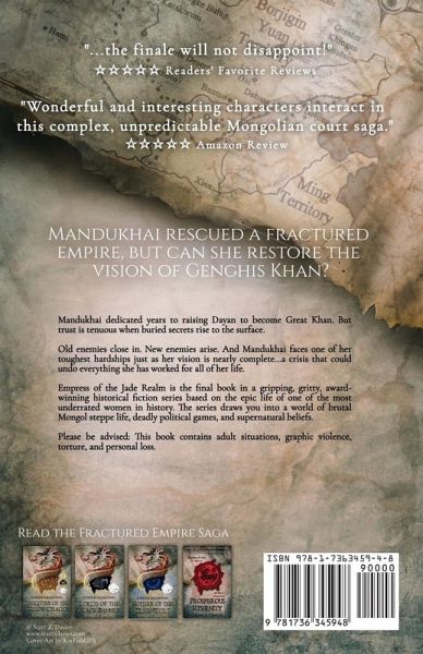 Mandukhai rescued a fractured empire, but can she restore the vision of Genghis Khan? Mandukhai dedicated years to raising Dayan to become Great Khan. But truth is dangerous. Trust is tenuous. Loyalties are tested. Secrets rise to the surface. Old enemies close in. New enemies arise. And Mandukhai faces one of her hardest obstacles just as her vision - the vision of Genghis Khan - is nearly complete. An obstacle that could undo everything she has worked for all of her life. Empress of the Jade Realm is the final book in the award-winning Fractured Empire Saga, based on the gritty, dark, true story of Lady Mandukhai. The series draws you into a world of brutal Mongol steppe life, deadly political games, and the desperate will to restore what was broken. ¿Please be advised: This book contains adult situations, graphic violence, and assault.