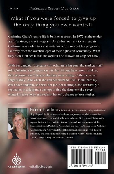Catharine Chase's entire life is built on a secret. In 1972, at the tender age of sixteen, she got pregnant. An embarrassment to her parents, Catharine was exiled to a maternity home to carry out her pregnancy far away from the watchful eyes of their tight-knit community. What they didn't tell her is that she wouldn't be allowed to keep her baby. With her daughter's screams still echoing in her ears, the medical staff told Catharine she'd move on with her life and have more children, they promised she'd forget. But they were wrong. Catharine never forgot Emily. And when she and her husband, Paul, learn that they can't have children, she risks her job, her marriage, and her family's reputation in a desperate attempt to find the daughter she never wanted to give away and reclaim her only chance to be a mother.