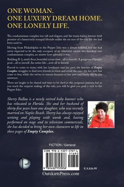 One woman. One luxury dream home. One lonely life. The condominium complex was tall and elegant, and the warm balmy breezes held promise of a luxuriously tranquil lifestyle unlike the rat race of the city life she had been used to. Moving from Philadelphia to the Pepper Isles was a dream fulfilled, but she had never expected to be the only occupant of an otherwise vacant two hundred unit condominium complex, no matter how splendid it was. Building B-2, ninth floor, beautiful ocean view...all to herself. A gorgeous Olympic pool...all to herself. An entire life...now all to herself. Forced to come to terms with her loneliness and her past, the heroine of Empty Complex struggles to find new friends in town and avoid the ones she has met, but come to fear, while she strives to remain buoyant in her new and lonely day to day existence. There are laughs to be shared and tears to be shed in this poignant journey, but as you reach the surprise ending of this tale, you will be glad you paid a visit to the Pepper Isles. "A Great Vacation Read" They are massive and they stand tall, lining the shores with promises of luxurious lifestyles and warm balmy breezes. Imagine you have purchased your dream home and are just starting to settle in when it becomes evident to you that you are the only one living in the entire building of two hundred units. Empty Complex is the story of such a woman and the complexities unraveling in her mind as she weathers the storms approaching her Pepper Isles community. She must come to terms with her loneliness, her past, and her present life as she makes new friends in town, fears others, and strives for her day to day existence. The story covers her complex life in a poignant journey all the way to the surprise ending. You will be mystified and perplexed. You will laugh and you may shed a tear but you will be glad to have spent a few hours in Pepper Isles.