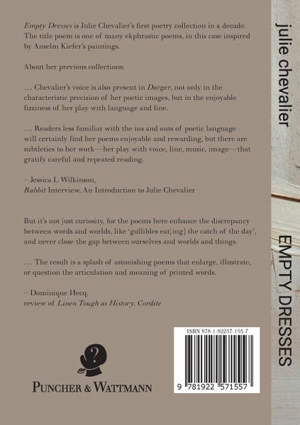 Empty Dresses is Julie Chevalier's first poetry collection in a decade. The title poem is one of many ekphrastic poems, in this case inspired by Anselm Kiefer's paintings. About her previous collections: ...Chevalier's voice is also present in Darger, not only in the characteristic precision of her poetic images, but in the enjoyable fizziness of her play with language and line. ...Readers less familiar with the ins and outs of poetic language will certainly find her poems enjoyable and rewarding, but there are other subtleties to her work - her play with voice, line, music, image - that gratify careful and repeated reading. - Jessica L Wilkinson, Rabbit Interview, An Introduction to Julie Chevalier