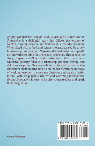 "Empty Dumpsters: Napkin and Sourdough's Adventure in Smokeville" is a delightful story that follows the journey of Napkin, a young raccoon, and Sourdough, a friendly opossum. When faced with a food and scraps shortage caused by a new human recycling program, Napkin and Sourdough come up with an innovative solution for their clans' problems. Throughout the story, Napkin and Sourdough's adventures take them on whimsical journey filled with friendship, problem-solving, and delicious surprises. Readers will be captivated by the lovable characters, their creative ideas, and the heartwarming message of working together to overcome obstacles and create a better future. With its playful narrative and charming illustrations, "Empty Dumpsters" is sure to inspire young readers and spark their imagination.