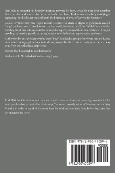 Paul Stiles is spending his Saturday morning mowing his lawn, when his next door neighbor dies a peculiar and spectacular death on Paul's front lawn. Paul knows something terrifying is happening, but he doesn't realize that it's the beginning of a war of survival for humanity. Islamic terrorists have paid rogue Russian scientists to create a plague of genetically created "bugs", and have turned them loose on the free world, intending to kill the "infidels" of the world. But they didn't take into account the unintended repercussions of these new creatures, like rapid breeding, or massive growth, or...using humans as both food and reproductive incubators. As the world is quickly taken over by these "bugs", Paul leads a group of survivors into the Rocky mountains, hoping against hope to find a way to combat the creatures...as long as they can stay away from those that have empty eyes. But will that be enough to save humanity? Find out in T. M. Bilderback's novel, Empty Eyes.