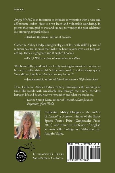 "Empty Me Full is an invitation to intimate conversation with a wise and affectionate seeker. But Catherine Abbey Hodges is no common questioner. Hers is a wit-laced and vulnerable wondering as she looks back over a life-loss of parents and recollection of girlhood pleasures, long marriage and motherhood. Exhilarated by relationship with human, animal, earth and sky, in language honed with care and cadence, her surprising turns of thought and discovery deepen our shared humanity. Without being sentimental, the book is rich with sentiment. Without dictating belief, the collection inspires reverence for the greater-than-human. In poems that turn grief to awe and sadness to wonder, the poet celebrates our stunning, imperfect lives. When she allows, 'It's not a sad thing, / perhaps, to be always a bit sad' we sigh into our shared frailty. And when she encourages 'a nod, a long gaze, three deep bows,' we comply." -Barbara Rockman Author of to cleave "'I sing of times trans-shifting,' said Robert Herrick, and so does Catherine Abbey Hodges in her new collection, Empty Me Full. She mingles elegies of loss with skillful praise of tenuous beauties in ways that make the heart rejoice even as it keeps on aching. These are gorgeous and thoughtful poems, self-consistent but full of surprising meanders and turns. Of all the poets that I know, Hodges is one of the few I return to again and again for repose and nourishment. 'Maybe time dreams us,' she says. 'Maybe it's alright to rest.'" -Paul J. Willis Author of Somewhere to Follow "The poems in Catherine Abbey Hodges' Empty Me Full ask deep and necessary questions of both the speaker and her readers. How to define clarity? What is sorrow, and why must we accept it? Who best explains faith? And even, 'Does it matter?' But everything matters to this poet, and she hungers for a response, if not an easy resolution; 'Spendthrift / world, it's me again, listening hard,' she writes. This beautifully paced book is a lovely, inviting incantation to notice, to be aware, to live this world 'a little more awake,' and to always query, 'how did we / get here? And can we stay forever?'" -Jen Karetnick Author of Inheritance with a High Error Rate "In Empty Me Full, Catherine Abbey Hodges tenderly interrogates the workings of time. She travels with remarkable ease through the liminal corridors between life and death, how we remember, and what we can know. 'What else don't we know?' asks the book's first poem. The answer: 'Almost / everything.' Her poetry carries in it a stillness that takes you into a brief respite of calm. Even death seems calm-recent death of her mother, a visitation from her dead father, the death of the stars. 'Because the end hovers,' she writes, 'I think we should kiss // and kiss and kiss....'" -Donna Spruijt-Metz Author of General Release from the Beginning of the World
