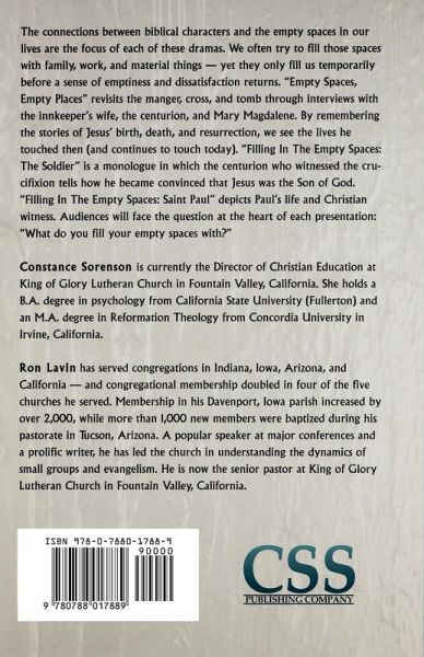 The connections between biblical characters and these empty spaces in our lives are the focus of three dramatic sketches. By revisiting the stories of Jesus' birth, death, and resurrection through interviews with the innkeeper's wife, the centurion, and Mary Magdalene, "Empty Spaces, Empty Places" shows us the lives Jesus touched then (and continues to touch today). The centurion who witnessed the crucifixion tells how he became convinced that Jesus was the Son of God in the monologue "Filling In The Empty Spaces: The Soldier." And the Apostle Paul's life and Christian witness is depicted in "Filling In The Empty Spaces: Saint Paul." Each presentation confronts audiences with the same question: "What do you fill your empty spaces with?" Constance Sorenson, the Director of Christian Education at King of Glory Lutheran Church in Fountain Valley, California, holds a B.A. degree in psychology from California State University (Fullerton) and an M.A. degree in Reformation Theology from Concordia University in Irvine, California. Ron Lavin has pastored congregations in Indiana, Iowa, Arizona and California -- and the churches where he has served have experienced remarkable growth. Membership in his Davenport, Iowa parish increased by over 2,000, while more than 1,000 new members were baptized during his pastorate in Tucson, Arizona. A popular speaker at major conferences and a prolific writer, he is especially well-known for his understanding of the dynamics of small groups and evangelism. He is currently the senior pastor at King of Glory Lutheran Church in Fountain Valley, California.