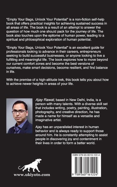 "Empty Your Bags, Unlock Your Potential" is a non-fiction self-help book that offers practical insights for achieving sustained success in all areas of life. The book is a result of an attempt to answer the question of how much one should pack for the journey of life. The book also touches upon the epitome of human power, leading to a spiritual and philosophical exploration of human potential. "Empty Your Bags, Unlock Your Potential" is an excellent guide for professionals looking to advance in their careers, entrepreneurs seeking to build successful businesses, or anyone looking to live a fulfilling and meaningful life. The book explores how to move beyond our current comfort zones and become the best versions of ourselves, make smart decisions, become resilient, and find balance in life. With the premise of a high-altitude trek, this book tells you about how to achieve newer heights in areas of your life.