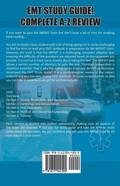 If you want to pass the NREMT Exam but don't have a lot of time for studying keep reading.... You are no doubt a busy student with a lot of things going on! It can be challenging to find the time to read your EMT textbook in preparation for the NREMT Exam. However, the truth is that the NREMT is a challenging computer adaptive test, meaning the difficulty of the questions are adjusted based on the responses you provide. It is normal to have some anxiety about taking this test. The NREMT only allows a certain number of attempts to pass the test. Thorough preparation is therefore essential. That is why the author Jamie Montoya, an EMS professional, developed the EMT Study Guide! It is a comprehensive review of the subject material and key concepts in your EMT textbook. It comes in text format, so that you can take it anywhere you go! Its sections include: Intro Overview Section 1: Airway, Respiration, and Ventilation Section 2: Cardiology and Resuscitation Section 3: EMS Operations Section 4: Medical and Obstetrics/Gynecology Section 5: Trauma Each section is divided into further subsections, making sure all aspects of the exam are covered! If you use our study guide and take the time to really understand the concepts, we are confident you will pass the NREMT and be on your way to a new career!