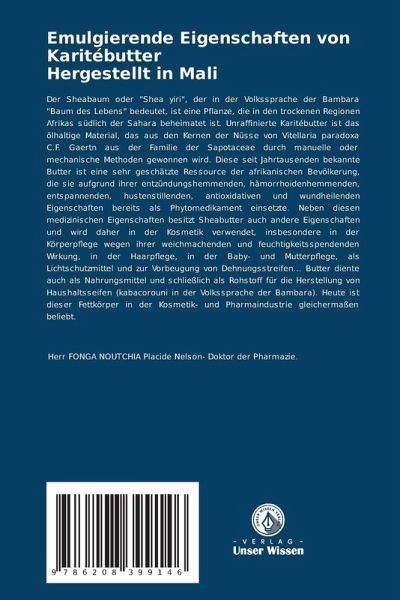 Der Sheabaum oder "Shea yiri", der in der Volkssprache der Bambara "Baum des Lebens" bedeutet, ist eine Pflanze, die in den trockenen Regionen Afrikas südlich der Sahara beheimatet ist. Unraffinierte Karitébutter ist das ölhaltige Material, das aus den Kernen der Nüsse von Vitellaria paradoxa C.F. Gaertn aus der Familie der Sapotaceae durch manuelle oder mechanische Methoden gewonnen wird. Diese seit Jahrtausenden bekannte Butter ist eine sehr geschätzte Ressource der afrikanischen Bevölkerung, die sie aufgrund ihrer entzündungshemmenden, hämorrhoidenhemmenden, entspannenden, hustenstillenden, antioxidativen und wundheilenden Eigenschaften bereits als Phytomedikament einsetzte. Neben diesen medizinischen Eigenschaften besitzt Sheabutter auch andere Eigenschaften und wird daher in der Kosmetik verwendet, insbesondere in der Körperpflege wegen ihrer weichmachenden und feuchtigkeitsspendenden Wirkung, in der Haarpflege, in der Baby- und Mutterpflege, als Lichtschutzmittel und zur Vorbeugung von Dehnungsstreifen... Butter diente auch als Nahrungsmittel und schließlich als Rohstoff für die Herstellung von Haushaltsseifen (kabacorouni in der Volkssprache der Bambara). Heute ist dieser Fettkörper in der Kosmetik- und Pharmaindustrie gleichermaßen beliebt.