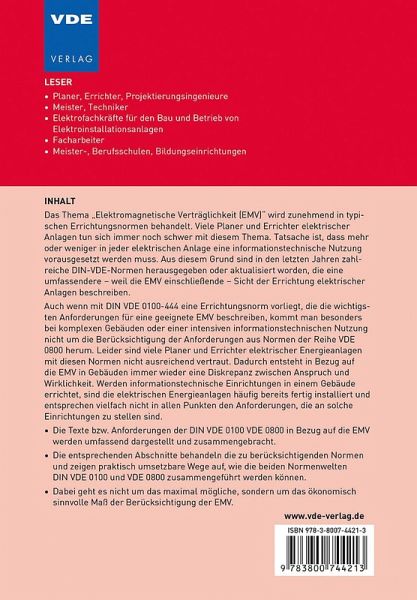 Das Thema "Elektromagnetische Verträglichkeit (EMV)" wird zunehmend in typischen Errichtungsnormen behandelt. Viele Planer und Errichter elektrischer Anlagen tun sich immer noch schwer mit diesem Thema. Tatsache ist, dass mehr oder weniger in jeder elektrischen Anlage eine informationstechnische Nutzung vorausgesetzt werden muss. Aus diesem Grund sind in den letzten Jahren zahlreiche DIN-VDE-Normen herausgegeben oder aktualisiert worden, die eine umfassendere - weil die EMV einschließende - Sicht der Errichtung elektrischer Anlagen beschreiben.Auch wenn mit DIN VDE 0100-444 eine Errichtungsnorm vorliegt, die die wichtigsten Anforderungen für eine geeignete EMV beschreiben, kommt man besonders bei komplexen Gebäuden oder einer intensiven informationstechnischen Nutzung nicht um die Berücksichtigung der Anforderungen aus Normen der Reihe VDE 0800 herum. Leider sind viele Planer und Errichter elektrischer Energieanlagen mit diesen Normen nicht ausreichend vertraut. Dadurch entsteht in Bezug auf die EMV in Gebäuden immer wieder eine Diskrepanz zwischen Anspruch und Wirklichkeit. Werden informationstechnische Einrichtungen in einem Gebäude errichtet, sind die elektrischen Energieanlagen häufig bereits fertig installiert und entsprechen vielfach nicht in allen Punkten den Anforderungen, die an solche Einrichtungen zu stellen sind.- Die Texte bzw. Anforderungen der DIN VDE 0100 VDE 0800 in Bezug auf die EMV werden umfassend dargestellt und zusammengebracht.- Die entsprechenden Abschnitte behandeln die zu berücksichtigenden Normen und zeigen praktisch umsetzbare Wege auf, wie die beiden Normenwelten DIN VDE 0100 und VDE 0800 zusammengeführt werden können.- Dabei geht es nicht um das maximal mögliche, sondern um das ökonomisch sinnvolle Maß der Berücksichtigung der EMV.