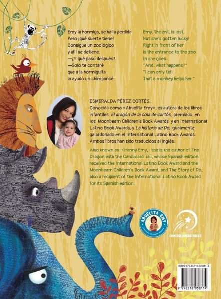 Emy la hormiga, se halla perdida Pero ¡qué suerte tiene! Consigue un zoológico y allí se detiene. - ¿Y qué pasó después? - Solo te contaré que a la hormiguita la ayudó un chimpacé. Emy, the ant, is lost. But she's gotten lucky! Right in front of her is the entrante to the zoo. In she goes... "And, what happens?" "I can only tell That a monkey helps her."