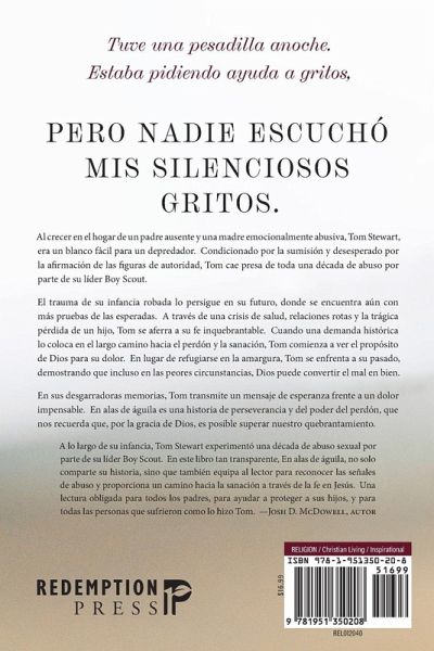 Tuve una pesadilla anoche. Estaba pidiendo ayuda a gritos, PERO NADIE ESCUCHO¿ MIS SILENCIOSOS GRITOS. Al crecer en el hogar de un padre ausente y una madre emocionalmente abusiva, Tom Stewart, era un blanco fäcil para un depredador. Condicionado por la sumisiön y desesperado por la afirmaciön de las figuras de autoridad, Tom cae presa de toda una de¿cada de abuso por parte de su li¿der Boy Scout. El t rauma de su infancia robada lo persigue en su futuro, donde se encuentra aün con mäs pruebas de las esperadas. A trave¿s de una crisis de salud, relaciones rotas y la trägica pe¿rdida de un hijo, Tom se aferra a su fe inquebrantable. Cuando una demanda histörica lo coloca en el largo camino hacia el perdön y la sanaciön, Tom comienza a ver el propösito de Dios para su dolor. En lugar de refugiarse en la amargura, Tom se enfrenta a su pasado, demostrando que incluso en las peores circunstancias, Dios puede convertir el mal en bien. En sus d esgarradoras memorias, Tom transmite un mensaje de esperanza frente a un dolor impensable. En alas de águila es una historia de perseverancia y del poder del perdón, que nos recuerda que, por la gracia de Dios, es posible superar nuestro quebrantamiento. A lo largo de su infancia, Tom Stewart experimentó una década de abuso sexual por parte de su líder Boy Scout. En este libro tan transparente, En alas de águila, no solo comparte su historia, sino que también equipa al lector para reconocer las señales de abuso y proporciona un camino hacia la sanación a través de la fe en Jesús. Una lectura obligada para todos los padres, para ayudar a proteger a sus hijos, y para todas las personas que sufrieron como lo hizo Tom. -Josh D. McDowell, autor