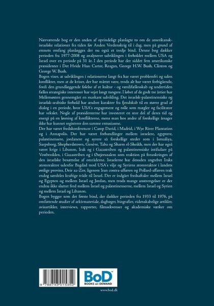 Nærværende bog er den anden af oprindeligt planlagte to om de amerikansk-israelske relationer fra tiden før Anden Verdenskrig til i dag, men på grund af emnets omfang planlægges der nu også et tredje bind. Denne bog dækker perioden fra 1977-2008 og analyserer udviklingen i forholdet mellem USA og Israel over en periode på 31 år. I den periode har der siddet fem amerikanske præsidenter i Det Hvide Hus: Carter, Reagan, George H.W. Bush, Clinton og George W. Bush. Bogen viser, at udviklingen i relationerne langt fra har været problemfri og uden konflikter, men at de kriser, der har måttet være, trods alt har været forbigående, fordi den grundlæggende følelse af et kultur- og værdifællesskab og undertiden fælles strategiske interesser har vejet langt tungere. I løbet af de godt tre årtier har Mellemøsten gennemgået en markant udvikling. Det israelsk-palæstinensiske og israelsk-arabiske forhold har ændret karakter fra fjendskab til en større grad af dialog i en periode, hvor USA's engagement og rolle som mægler og facilitator har vekslet. Nogle af præsidenterne har investeret en stor del af deres tid og energi på en løsning af konflikterne, mens man hos andre af forskellige årsager ikke har kunnet registrere den samme entusiasme. Der har været fredskonferencer i Camp David, i Madrid, i Wye River Plantation og i Annapolis. Der har været forhandlinger mellem israelere, egyptere, palæstinensere, jordanere og syrere så forskellige steder som i Ismailiya, Sarpsborg, Shepherdstown, Genève, Taba og Sharm el-Sheikh, men der har også været krige i Libanon, Irak og i Gazastriben og palæstinensiske intifadaer på Vestbredden, i Gazastriben og i Østjerusalem som reaktion på forankringen af den israelske besættelse af områderne. Israelerne har desuden angrebet Iraks atomreaktor udenfor Bagdad mod USA's vilje og Syriens atomreaktor i landets østlige provins, Deir az-Zor, ligesom Iran contra-affæren og Pollard-affæren trak endog særdeles kraftige tråde til Israel. Der er indgået fredsaftaler mellem Israel og Egypten og mellem Israel og Jordan, men trods mange anstrengelser er der endnu ikke sluttet fred mellem Israel og palæstinenserne, mellem Israel og Syrien og mellem Israel og Libanon. Bogen bygger som det første bind, der dækker perioden fra 1933 til 1976, på omfattende studier af arkivmateriale, dagbøger, biografier, videnskabelige artikler, avisartikler, interviews, rapporter, filmsekvenser og akademiske værker om perioden.